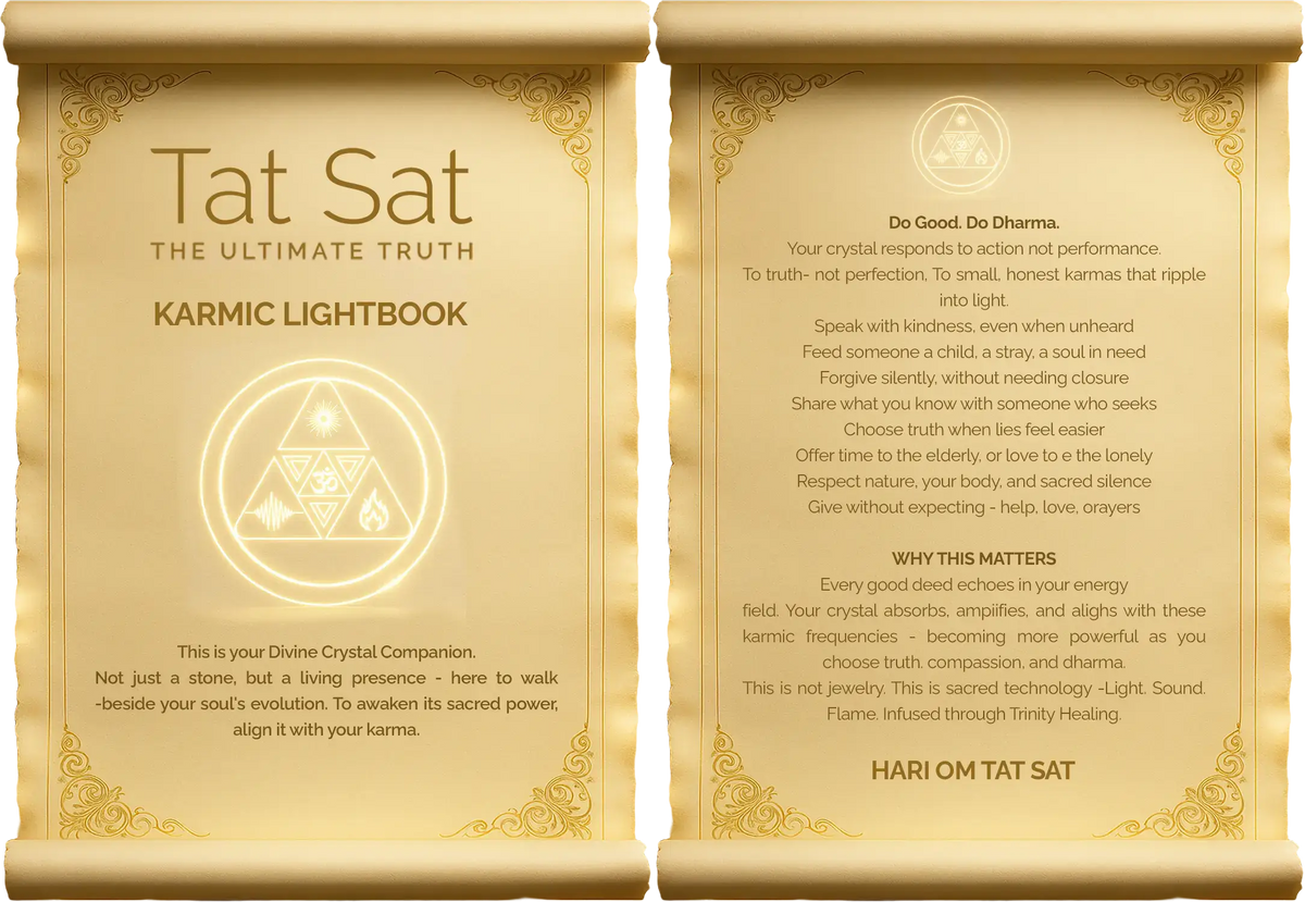Each Tat Sat piece comes with a sacred guide. The Karmic Lightbook This is not a rulebook, but a divine manual for your soul. It outlines the karmic actions, mindset shifts, and aligned practices you must adopt to truly activate the energy of your chosen crystal. Because energy doesn’t respond to intention alone, it responds to action with awareness. Following the Karmic Lightbook helps: